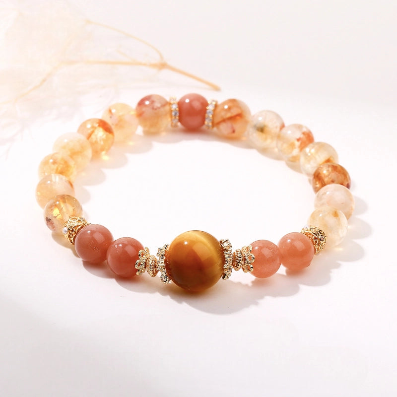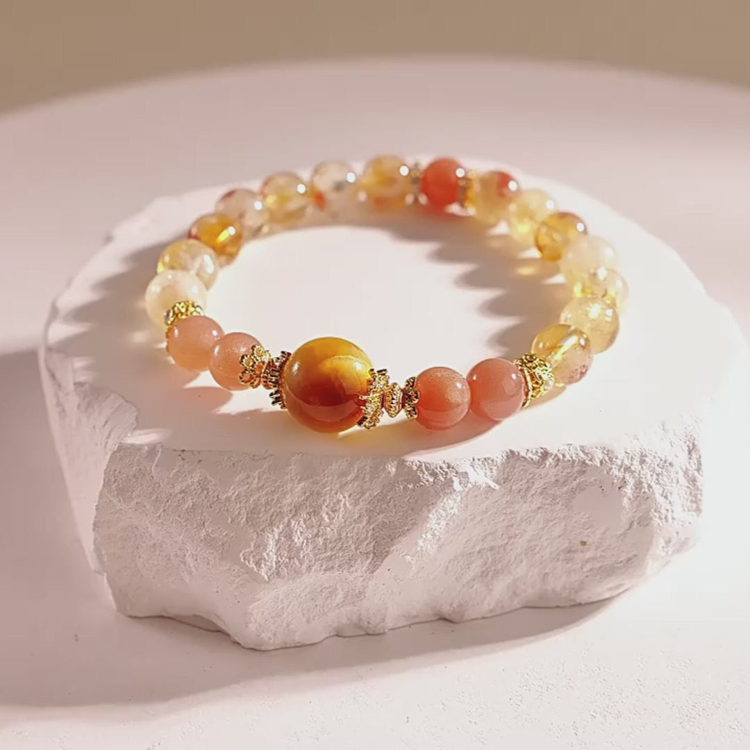 At the center, a bold Golden Tiger’s Eye anchors the bracelet with courage and confidence — helping you stay steady and self-assured. It’s flanked by shimmering Sunstone, known for igniting inner joy, vitality, and strength. Surrounding it all, Citrine beads sparkle with abundance energy, encouraging manifestation and prosperity on all levels — emotional, spiritual, and material. Together, these stones create a high-vibe trifecta of empowerment.