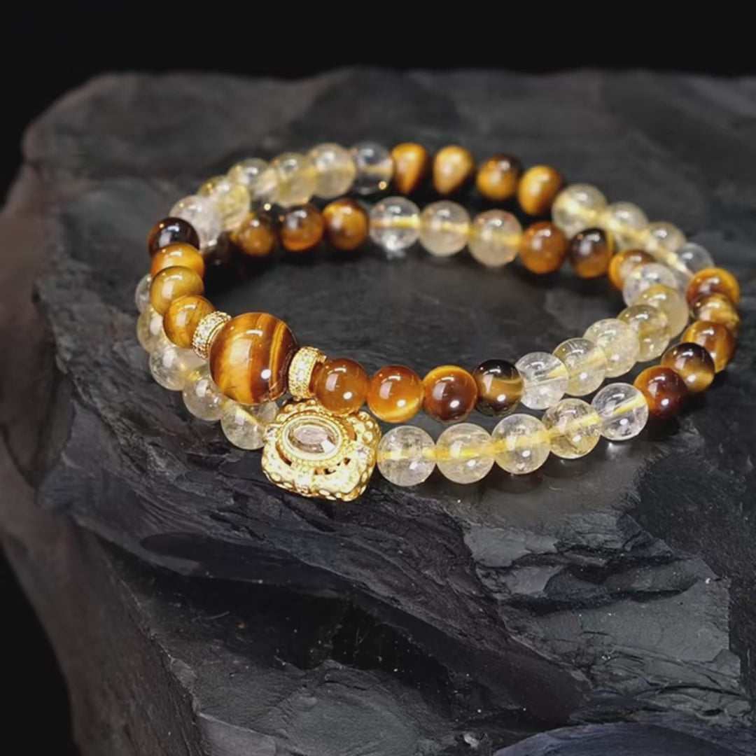 An exquisite double-layered bracelet, our Focus & Strength Bracelet featuring the natural brilliance of Tiger Eye and Gold Rutilated Quartz, finished with luxurious gold-plated copper charms.