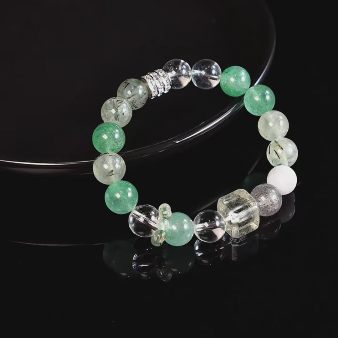 "Let the green harmony bracelet guide your spirit; prehnite for clarity, green strawberry for sweetness—they blend into your best self."