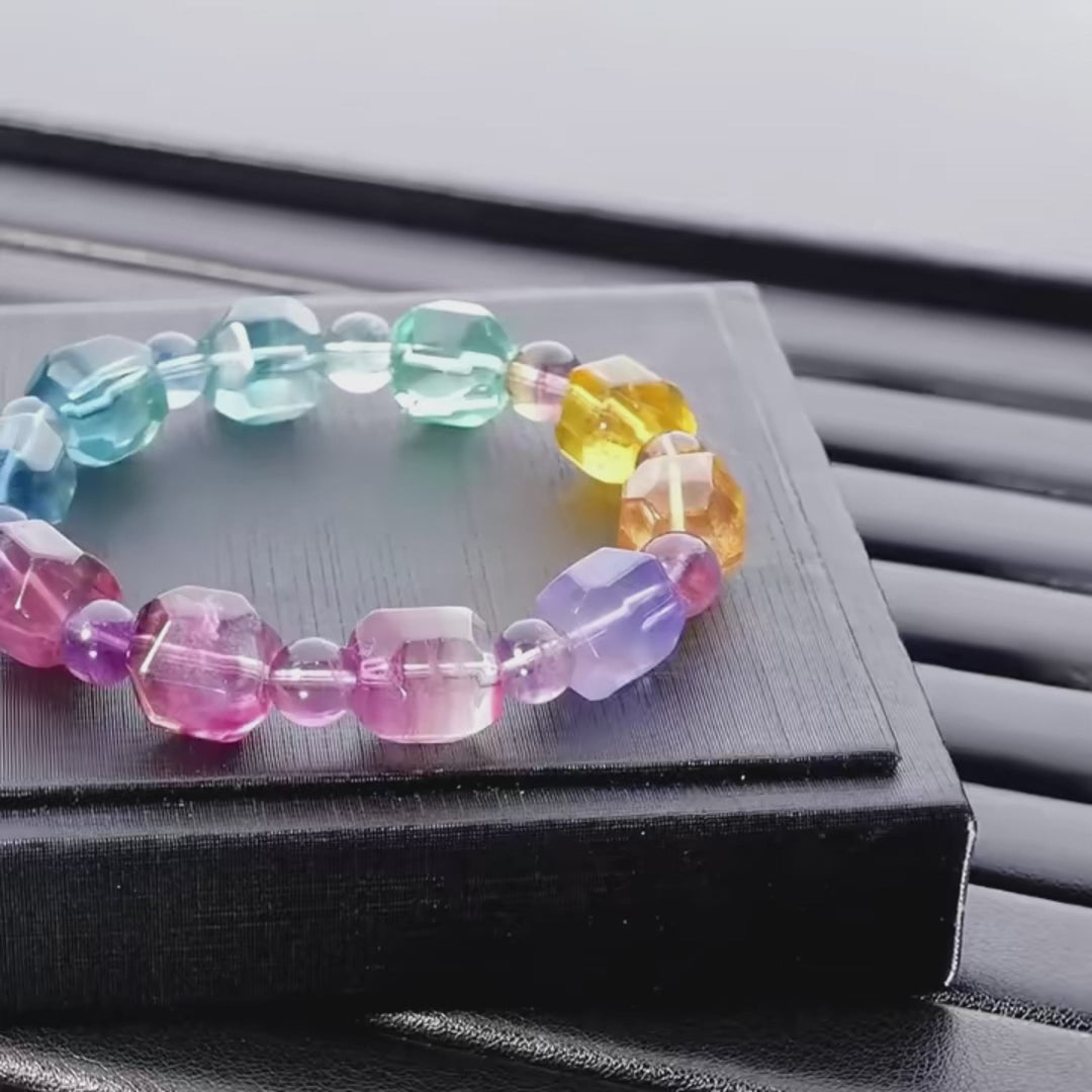 Add a burst of vibrant color and unique energy to your accessory collection with our Irregular Rainbow Fluorite Bracelet, hand-polished irregular beads give the bracelet a bold, organic charm, making it truly one-of-a-kind.