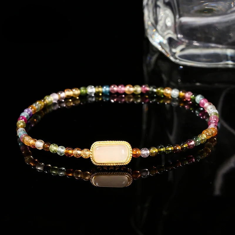 Bright, colorful, and full of positive energy, our Rainbow Fortune Bracelet is handcrafted with high quality Ice Rainbow Tourmaline beads and features a White Jade centerpiece set in a golden frame.