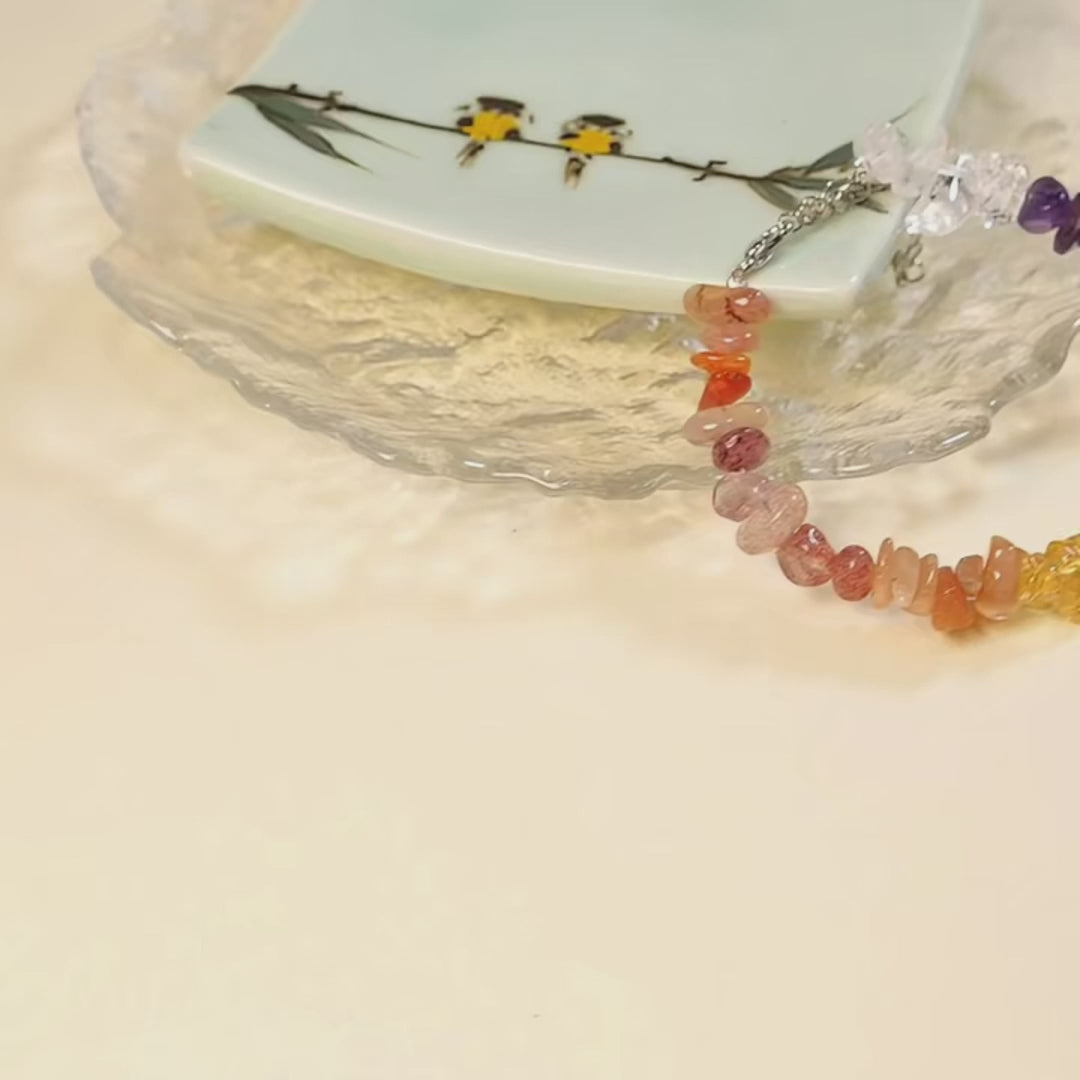 Introducing to our 7 Chakras Chain Bracelet – a radiant alignment of color and energy, crafted with the symbolic stones of each chakra. From the clarity of clear quartz to the calm of amethyst, the flow of aquamarine, the nurturing green of aventurine, the joy of citrine, the vitality of carnelian, and the warmth of strawberry quartz, this bracelet brings together all seven chakra energies in a delicate yet powerful chain.