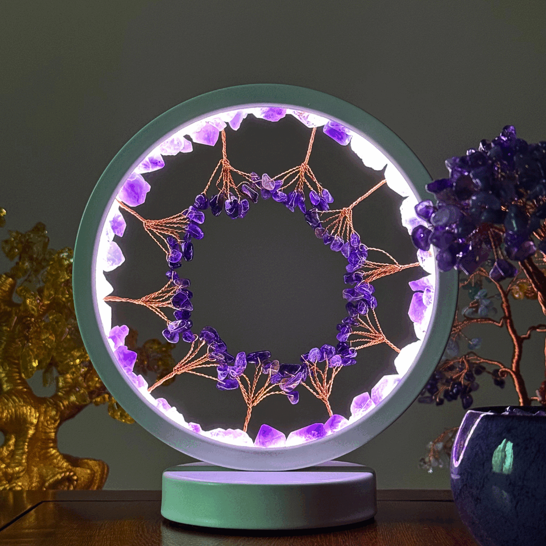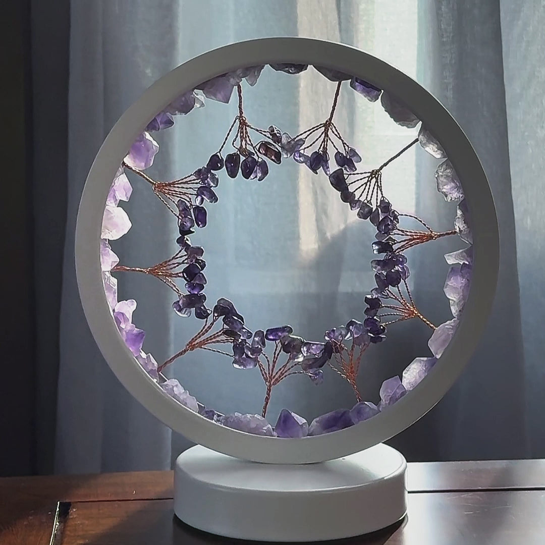 The halo shape of the lamp represents wholeness, eternity, and the continuous cycle of energy. Serves as a protective boundary, containing and amplifying the calming vibrations of the crystals within.